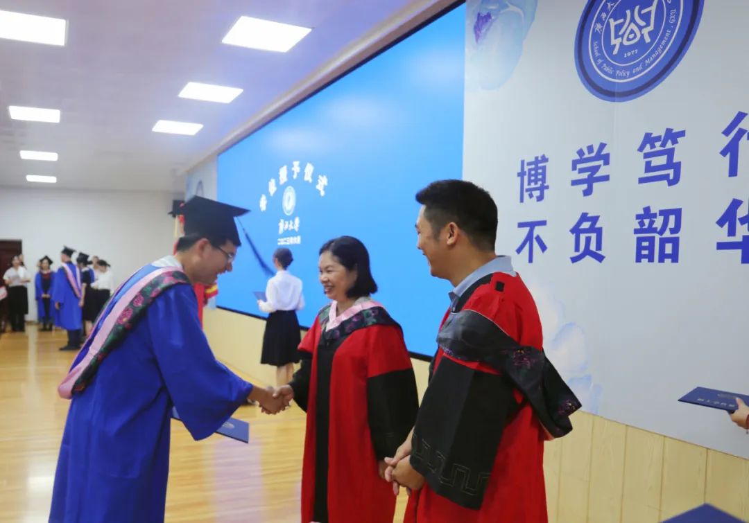 学位授予环节,周均旭宣读学位授予决定,毕业生们随着礼乐声依次上台。毕业班班主任雷文艳、钟革秋为学生整理衣冠,聂鑫为毕业生行拨穗礼,并一一合影,黎昌珍教授与魏万青教授分别和毕业生握手祝贺。最后,在全体师生的校歌大合唱中,熟女 公共管理专业硕士(MPA)毕业典礼暨学位授予仪式圆满落幕。
