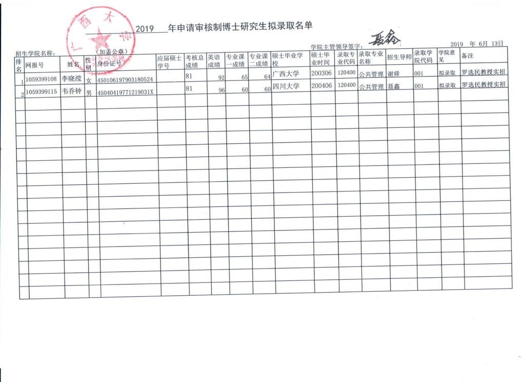 2019年申请审核制博士研究生拟录取名单(二)