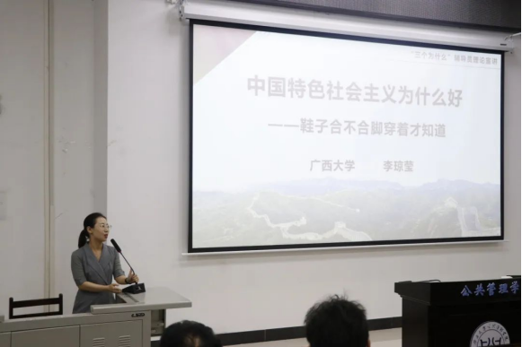 李琼莹对“中国特色社会主义为什么好”进行宣讲,她以习近平总书记提出的“鞋子合不合脚,穿着才知道”这一理论引出中国特色社会主义好在“主义真”、“道路新”、“制度优”、“贡献大”四个方面。李琼莹详细论述了中国特色社会主义是能真正解决中国实际问题的、是独立自主,以人民为中心的、是能够发挥全国一盘棋效能的、是为世界和平发展作出巨大贡献的制度。