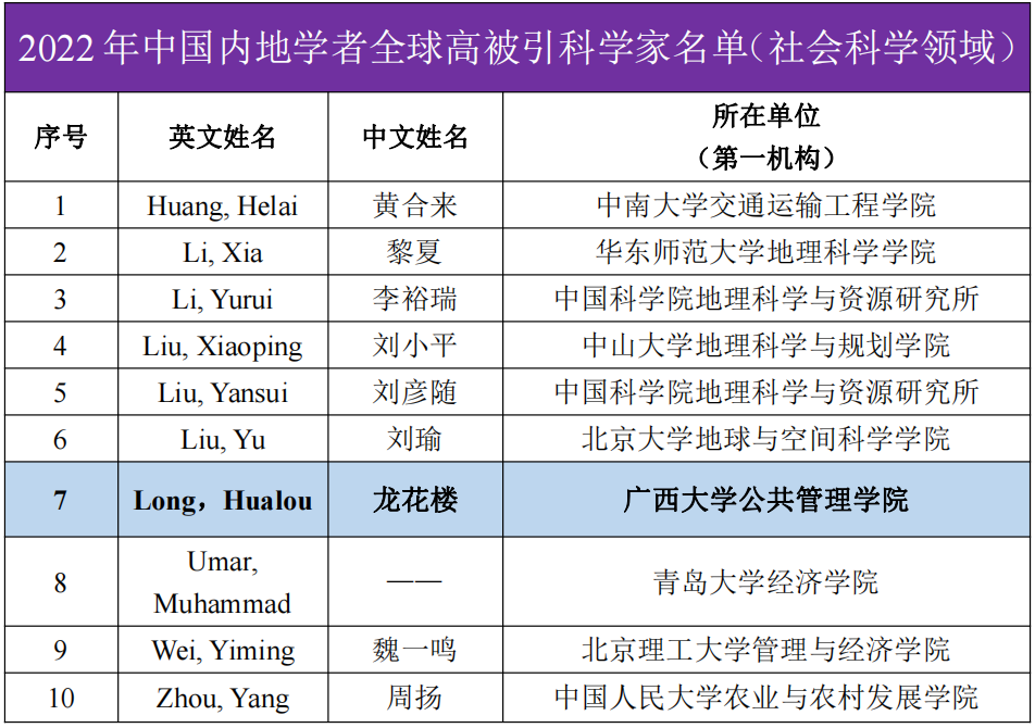 11月15日,科睿唯安(Clarivate)发布了2022年度全球“高被引科学家”(Highly Cited Researchers)榜单,来自全球69个国家和地区的6938名科学家入榜,其中,中国内地入榜1169人。熟女 龙花楼教授入选社会科学领域的全球高被引科学家榜单(社会科学领域的内地学者本年度共有10名上榜)。入选“高被引科学家”榜单,说明该科学家论文被引频次在Web of Science™ 中位于同学科、同发表年份的前1%,体现了在同行之中卓越的学术影响力,为该学科领域的发展作出了卓越的贡献。龙教授2015-2021年连续7年入选Elsevier中国高被引学者,2019-2022年连续4年入选全球高被引科学家,受到国内外同行研究者高度认可与评价。