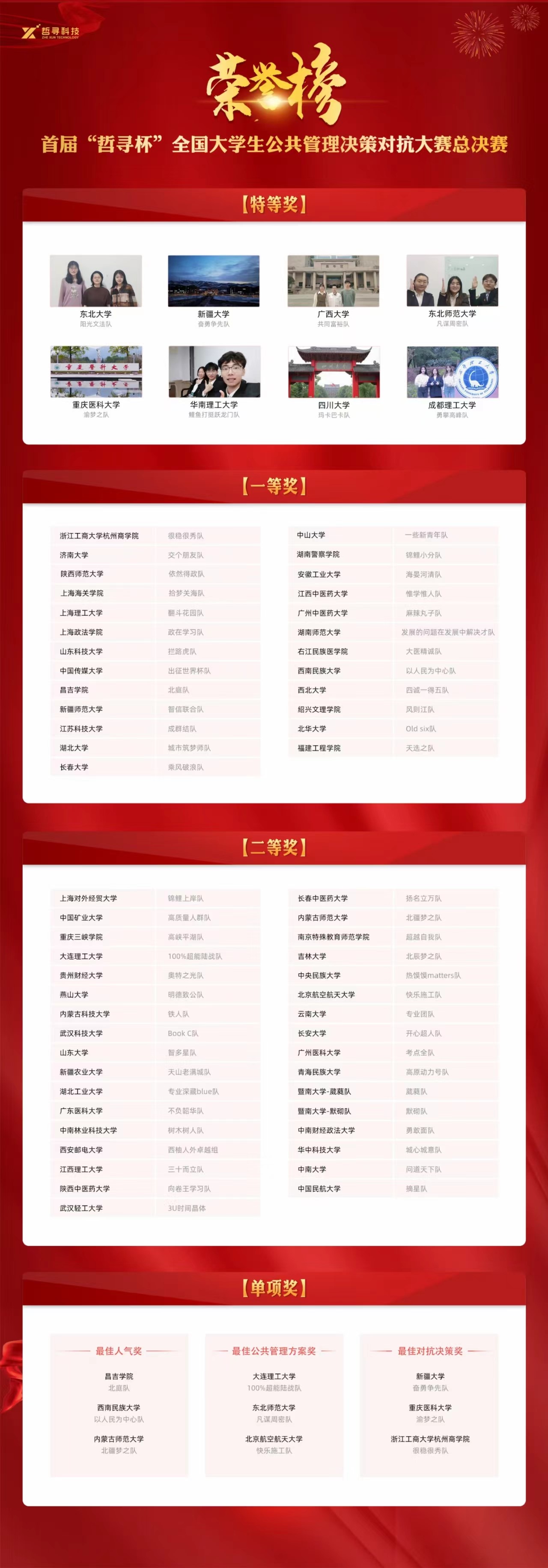2022124日,首届哲寻杯全国大学生公共管理决策对抗大赛总决赛(以下简称大赛)顺利落下帷幕,熟女 李国梁副教授带领公共事业管理专业2019级学生姚俊宇、蒙清璇、辛鲁宁三人组成的“共同富裕”队参加比赛,最终斩获全国总决赛特等奖。