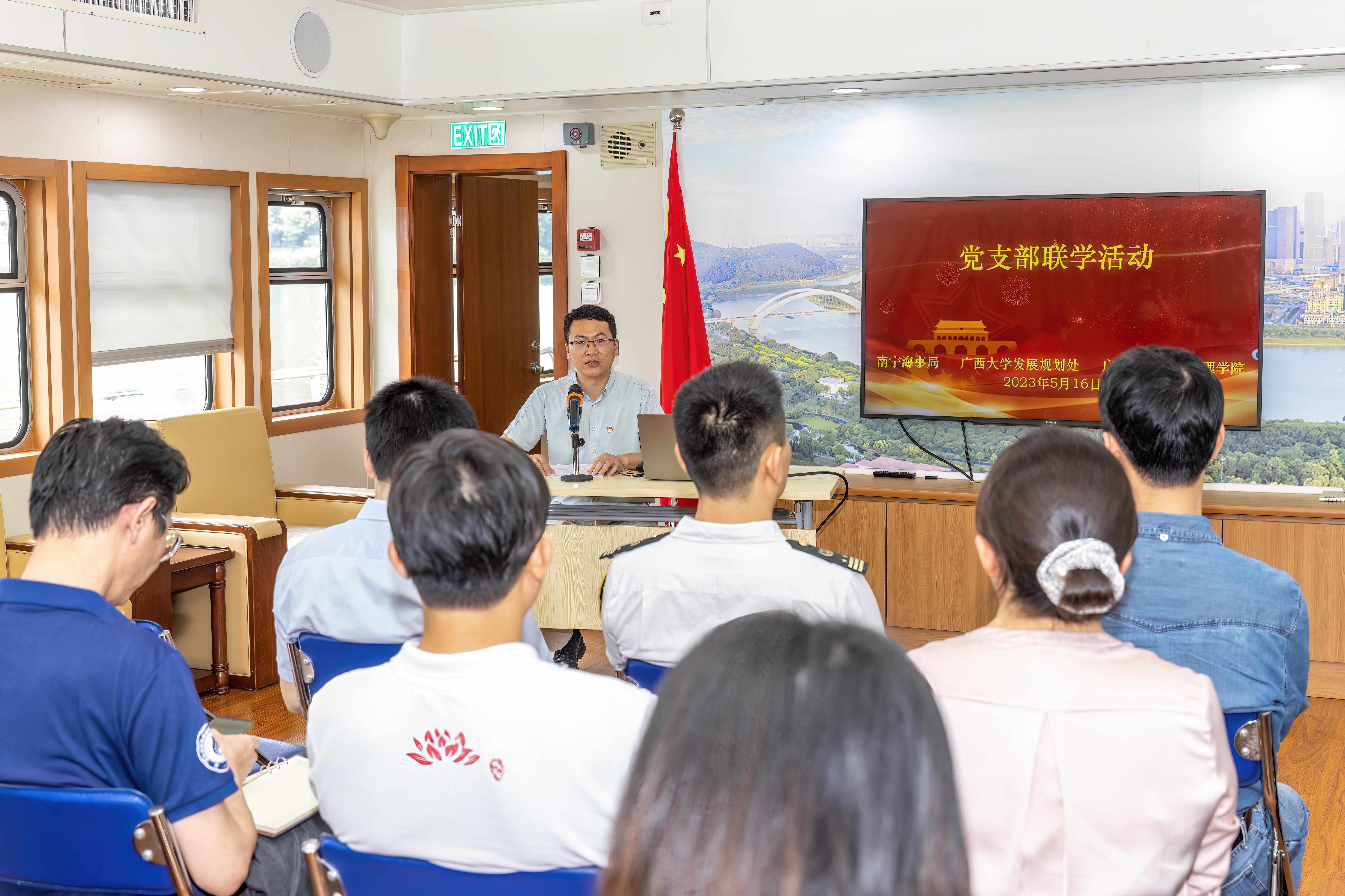 在南宁海事局党委委员、副局长黄锐的带领下,熟女 和熟女 发展规划处的党员同志们首先参观了海巡1011“邕江流动党校”,详细了解南宁海事局党建工作的新思路、新理念、新方式,并学习其以“红船精神”为引领,维护南宁首府水域安全、推动平陆运河建设的党建与业务相结合的优秀经验。 随后熟女 发展规划处副处长、党支部青年及统战委员马仲辉同志以“学科建设服务地方经济社会发展”为主题讲专题党课。