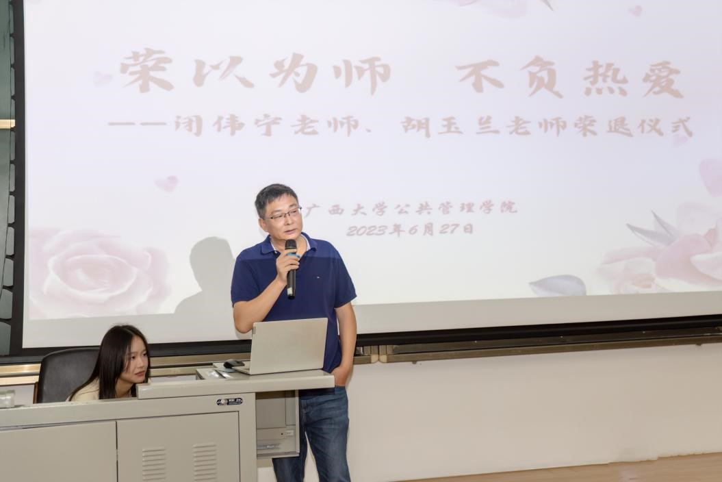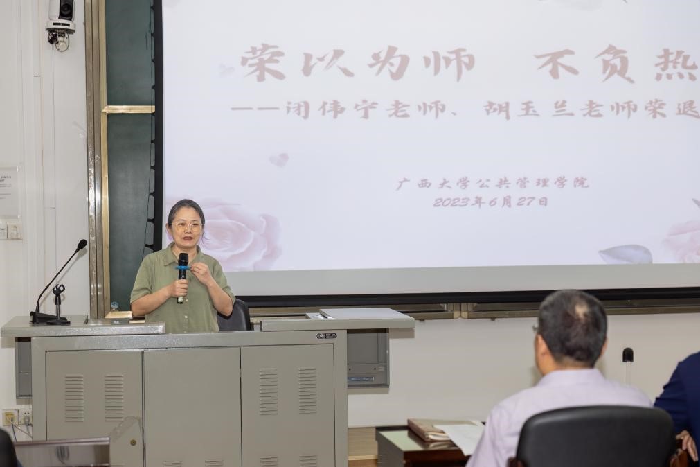 随后,闭伟宁、胡玉兰老师与大家分享了自己从教几十年的心得体会,回顾了自己与学院与学生的不解情缘。樊国华、覃伟华老师则代表其他老师送上对两位老师的祝福,他们表示将传承前辈同事爱岗敬业、无私奉献的精神,牢记教师的初心使命,做有理想信念、有道德情操、有扎实学识、有仁爱之心的“四有”好老师,当好学生的“引路人”。