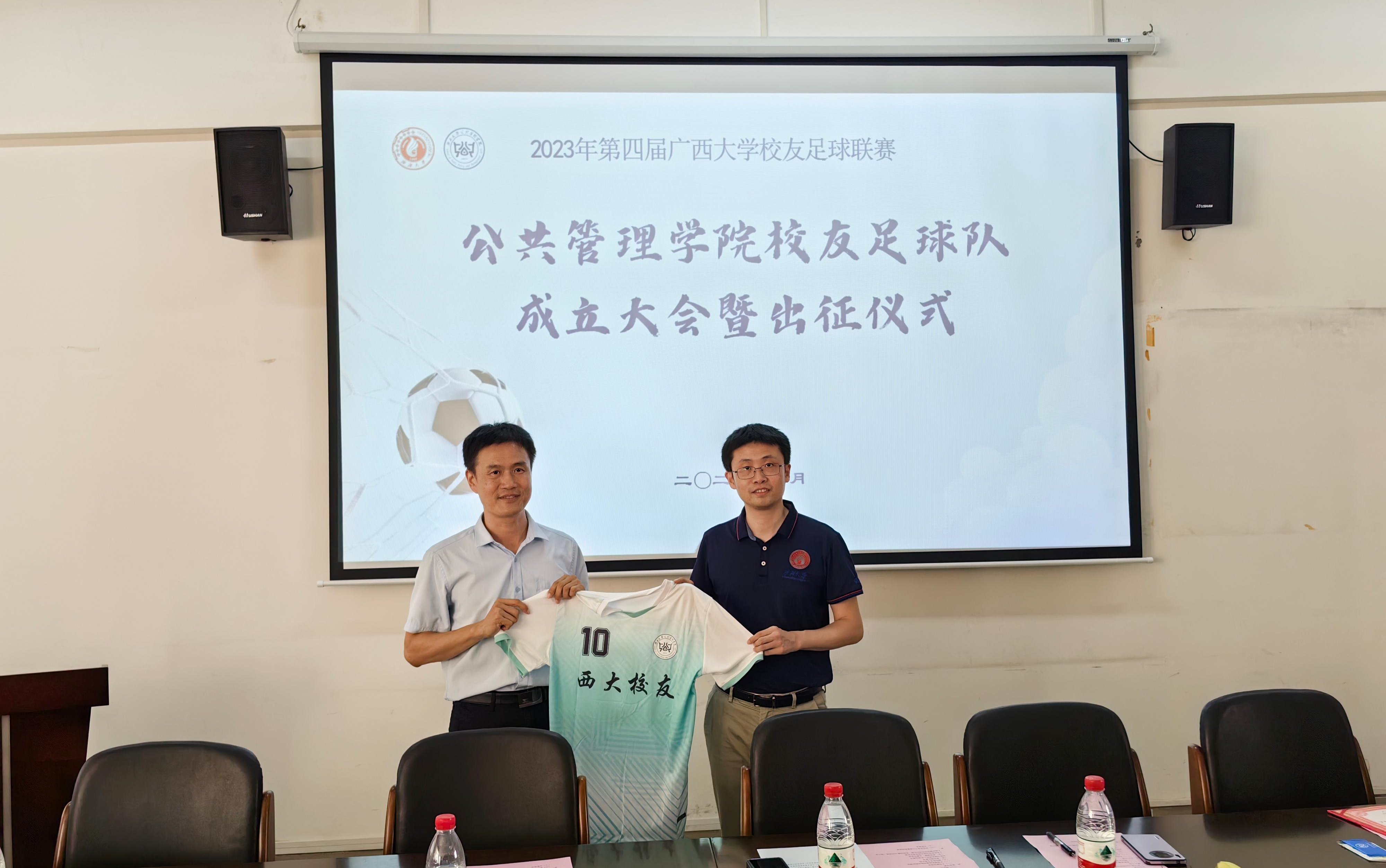 校友足球队在学院相关领导与各界校友的见证下在学院417会议室正式成立,学院党委书记聂鑫、副书记庞惠与校友代表共同出席成立大会。