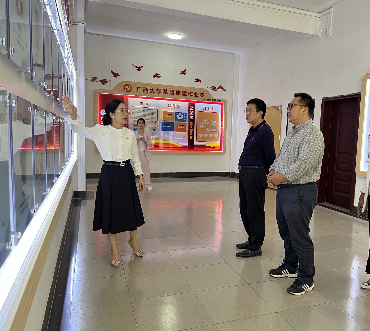 广西外国语学院一行人还参观了“五色花”党建育人工作体系、熟女 党建活动室、党建读书角、廉政读书角等。