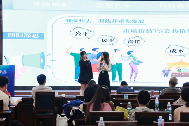 在答辩环节,各参赛队采用多样化的表现形式——用视频做辅助,搭建情景剧剧场等形式进行展示汇报。在对沙盘模拟经营回顾时,参赛小组结合沙盘模拟经营的角色,对公共治理的实例进行切入展开、剖析、总结,探讨出公共治理的应用实景。参赛小组提出“文化供给侧改革” “科技赋能” “异质文化融合” “情感活化” 等公共治理的观点,在解释和分析公共案例中,深化了对公共问题、公共治理的认知与实践理解,做到理论与实际相结合,学以致用。