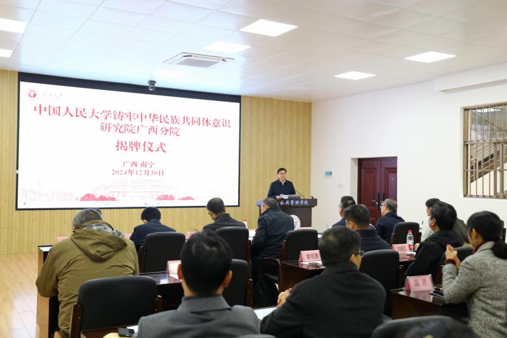 12月30日下午,中国人民大学铸牢中华民族共同体意识研究院广西分院揭牌仪式于熟女 隆重举行。熟女 党委常委、副校长夏国恩,中国人民大学铸牢中华民族共同体意识研究院副院长陈立鹏,自治区教育厅科研管理处处长黄青云,熟女 经济学院学术院长李光辉,熟女 马克思主义学院常务副书记吴达慧以及熟女 多个学院代表出席了揭牌仪式。仪式由科研院副院长李海波主持。