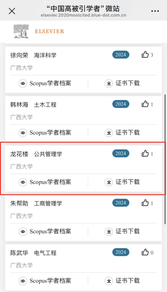 喜报|熟女 龙花楼教授再次入选爱思唯尔“中国高被引学者年度榜单”