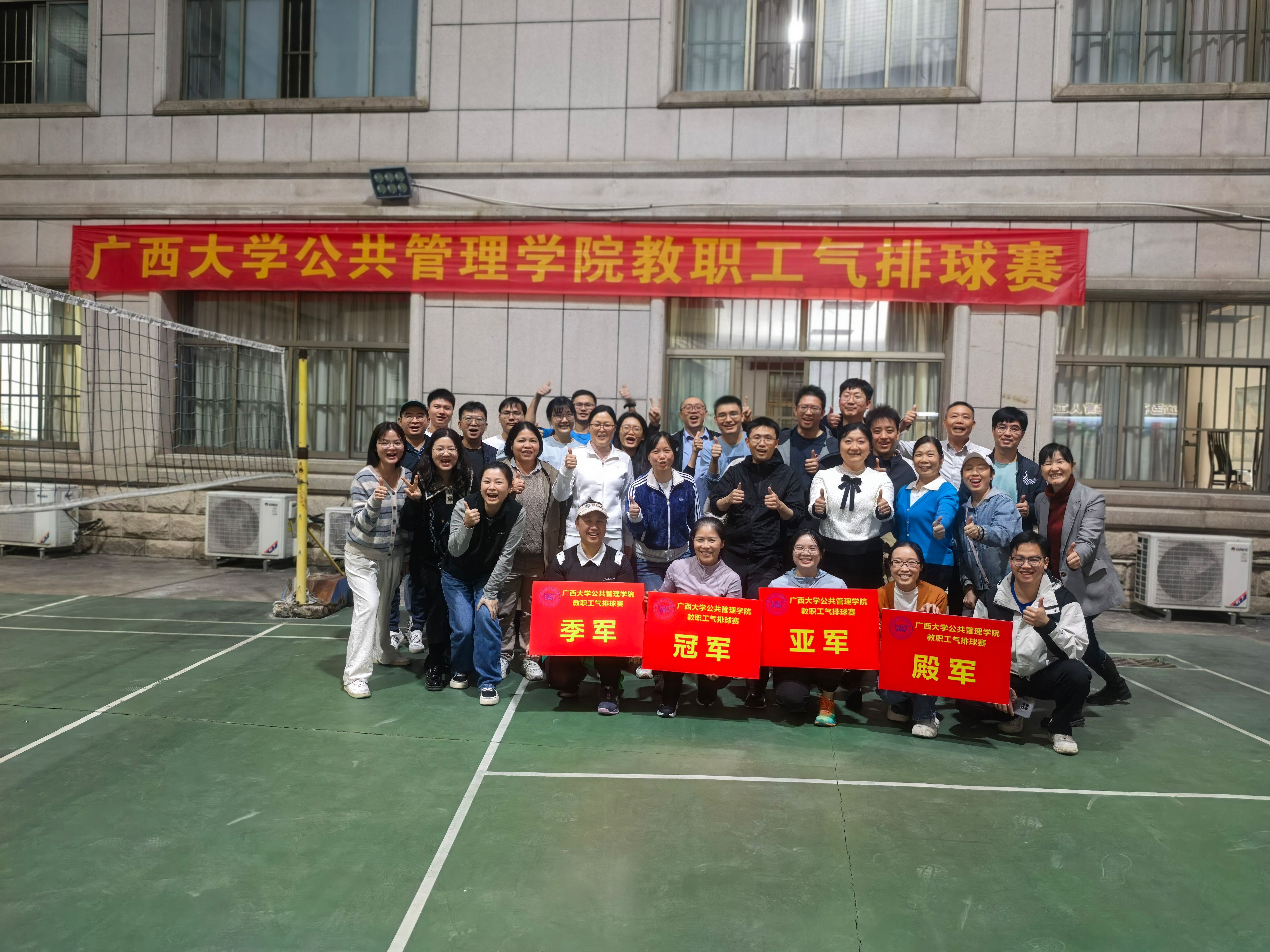 11月19日下午,随着哨声响起,比赛正式拉开帷幕。赛场上,队员们默契配合,发球、拦网、扣杀等动作行云流水,每一次精彩得分都引来阵阵喝彩。为期三天的赛程中,四支队伍循环交锋,悬念迭起。综合行政队凭借稳定发挥与出色协作一路领跑,最终斩获冠军;土地资源管理系队顽强拼搏、敢打敢拼,荣获亚军;行政管理系队在关键场次沉稳应对,成功拿下季军;社会保障与公共政策系队全力以赴、赛出风格,获得殿军。
