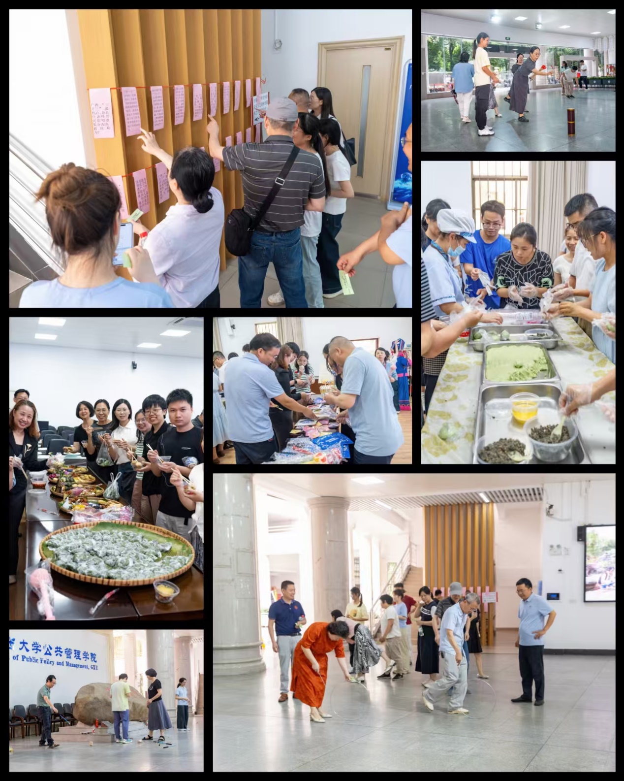 在分工会主席短暂的介绍后,活动正式进入精彩的体验环节。在“华服锦绣·和美同心”板块,教职工们兴致盎然地穿戴壮族、瑶族、苗族、侗族等精美民族服饰,感受各民族服饰纹样所承载的文化寓意与共同审美追求。活动现场气氛在“趣味竞技·同心聚力”环节持续升温、燃动全场,射箭、打陀螺、踢毽子、抢绣球等传统民族体育项目吸引了众人踊跃参与,一旁的“三月三”民俗知识问答也让大家在互动中增长了见识。活动最后,大家一同制作青团,品尝簸箕宴、五色糯米饭、油茶等特色美食,在“舌尖上的民族风情”中,共叙团结同心之情。