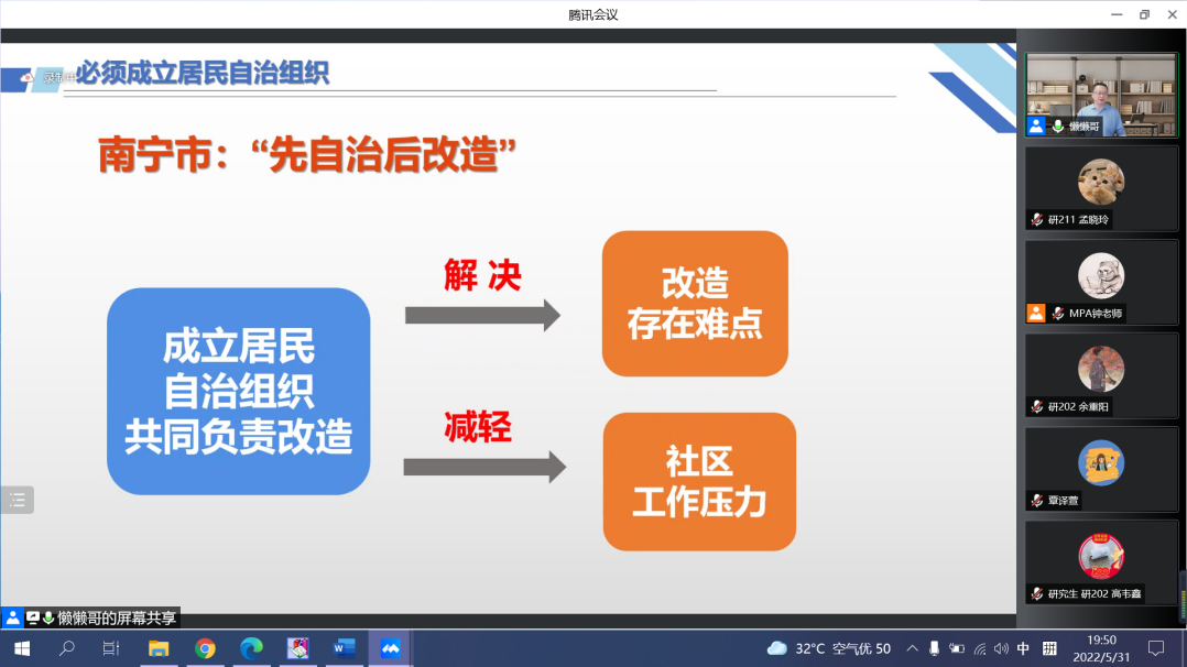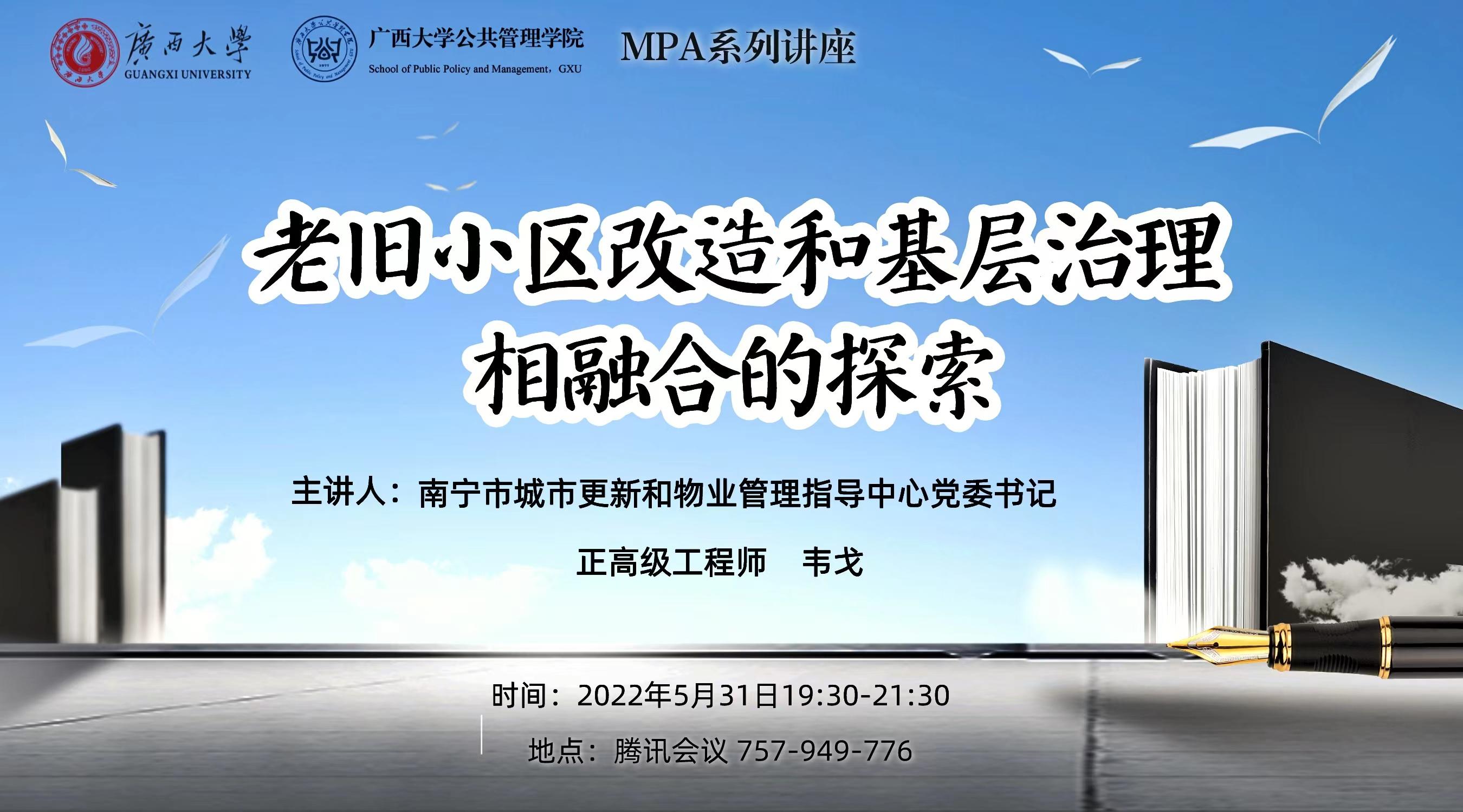 5月31日晚,熟女 成功举行“老旧小区改造和基层治理相融合的探索”主题讲座,是MPA系列讲座之一。本次讲座的主讲嘉宾南宁市城市更新和物业管理指导中心党委书记、正高级工程师韦戈。熟女 副院长周均旭教授主持本次讲座。讲座通过腾讯会议线上进行,学院200余名师生参加。
