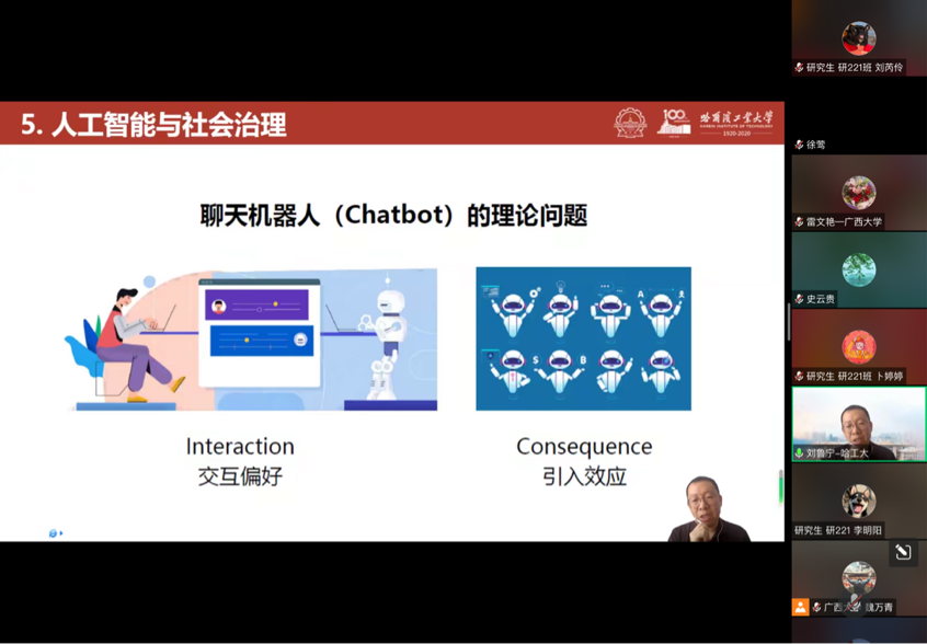 在交流互动环节,熟女 陈璟浩老师向刘教授请教了有关科研团队的组织问题,魏教授也提出如何将聊天机器人的试点实验进行外推的问题,刘教授针对以上问题一一进行解答,与大家进行了深入的交流。接近尾声,史院长分享了自己在听完讲座后的感受,他指出做研究应当要聚焦,不能四面出击,同时赞扬刘教授在路径、理念上都为大家提供了新的研究治理视角。最后,魏教授对刘教授的分享表示感谢,讲座在热烈的氛围中圆满结束。