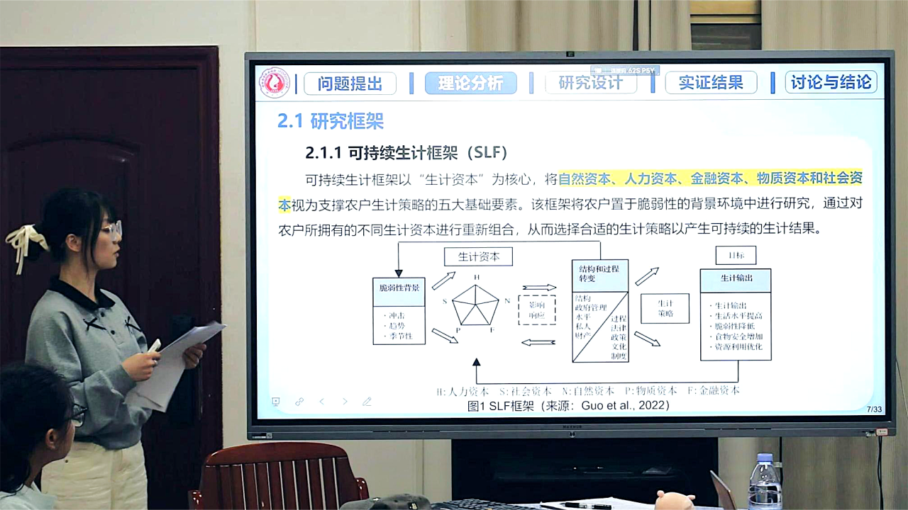 朱雅莹同学分享的论文题为《生计资本组态对边疆地区农户耕地质量保护行为的影响——基于广西816个农户调查的混合方法研究》。该研究从为何需重点关注农户耕地质量保护行为出发,提出核心观点:个体逐利对耕地质量的影响,本质是农户生计诉求与社会生态系统稳健性之间的矛盾。基于广西 816 户农户的调查数据,研究采用混合研究方法,最终发现,唯有通过集体行动串联资源用户、共享资源、公共基础设施及供给主体的生计资本组态路径,才能实现社会生态系统的稳健性,进而推动农户主动实施耕地保护行为。