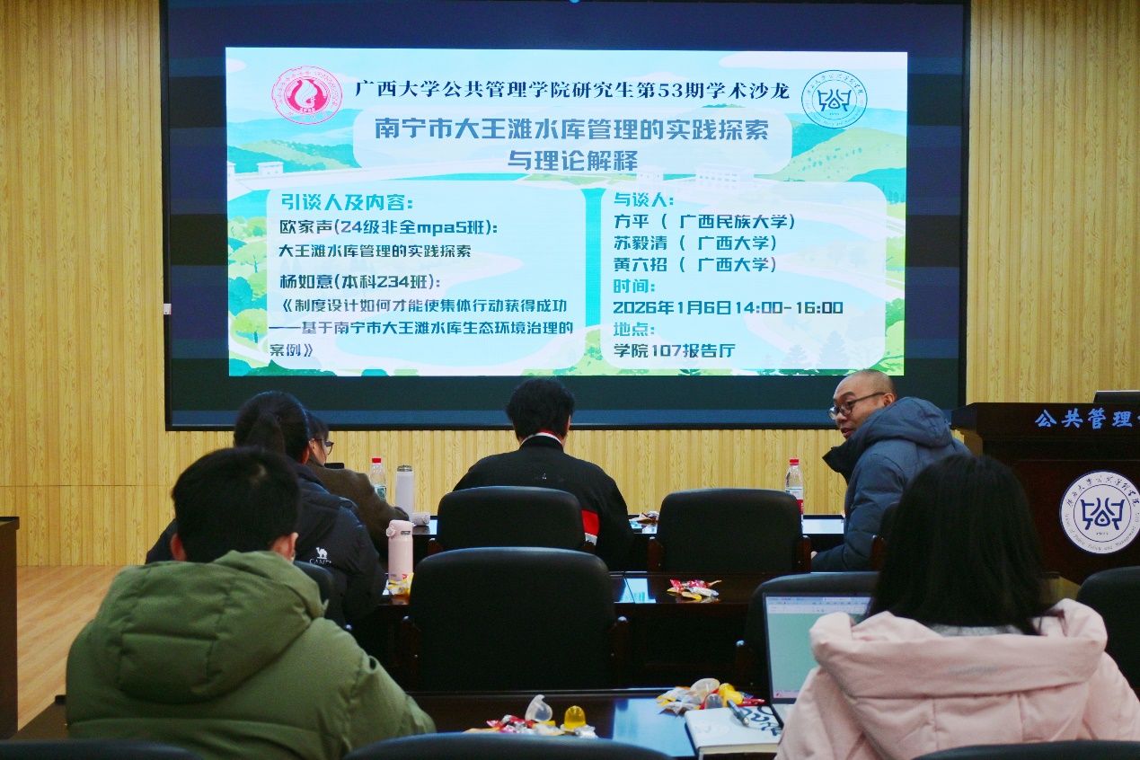 2026年1月6日下午,熟女 暨广西高校人文社会科学重点研究基地——区域社会治理创新研究中心第五十三期学术沙龙在学院107报告厅成功举行。本期沙龙聚焦“南宁市大王滩水库管理的实践探索与理论解释”主题,由24级非全日制硕士研究生欧家声、23级本科生杨如意担任引谈人,方平、苏毅清、黄六招三位老师担任与谈人。讲座深化了师生对相关领域的研究认知,吸引了全院众多师生参与。