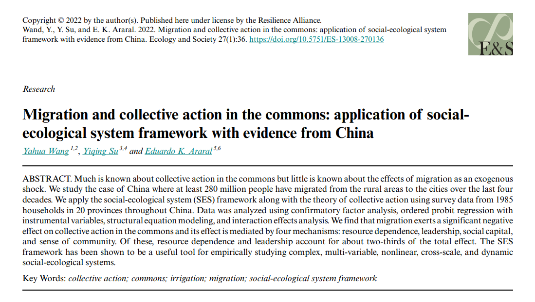 Wang, Y., Y. Su*, and E. K. Araral. 2022. Migration and collective action in the commons: application of social-ecological system framework with evidence from China. Ecology and Society 27(1):36.