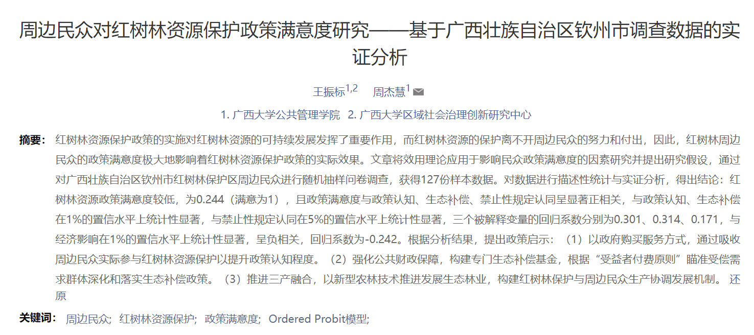 王振标,周杰慧.周边民众对红树林资源保护政策满意度研究——基于广西壮族自治区钦州市调查数据的实证分析[J].林业经济,2022,44(04):85-96.