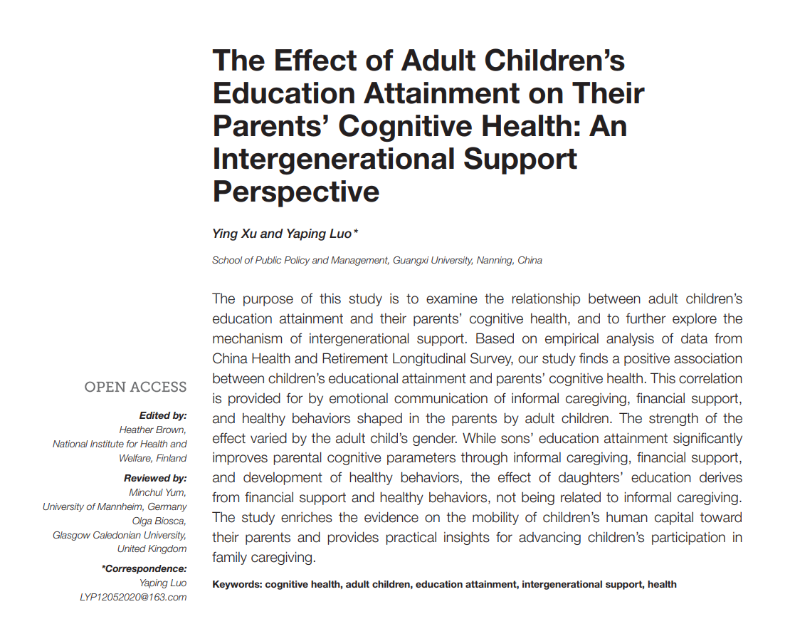 徐莺、罗亚萍在Frontiers in Public Health发文探讨成年子女受教育程度对父母认知健康的影响