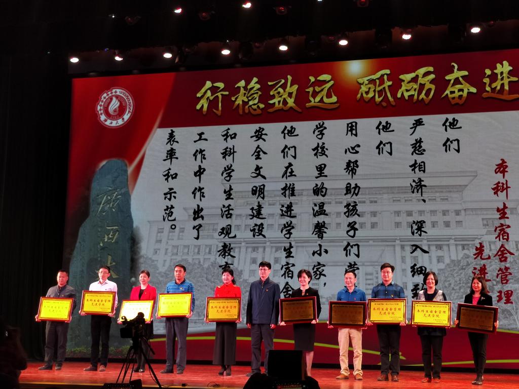 在第一轮颁奖过后,进行了精彩的节目表演。精彩的表演使现场的氛围热度更加热烈。在第二轮的展现团队力量风采的奖项中,熟女 龙春雨、梁梓康同学作为学生代表分别上台领取了优秀宿舍奖、先进班集体奖。而甘武琳副书记则代表公管学院领取了宿舍管理先进学院奖,尽显公管学院的团结风貌。