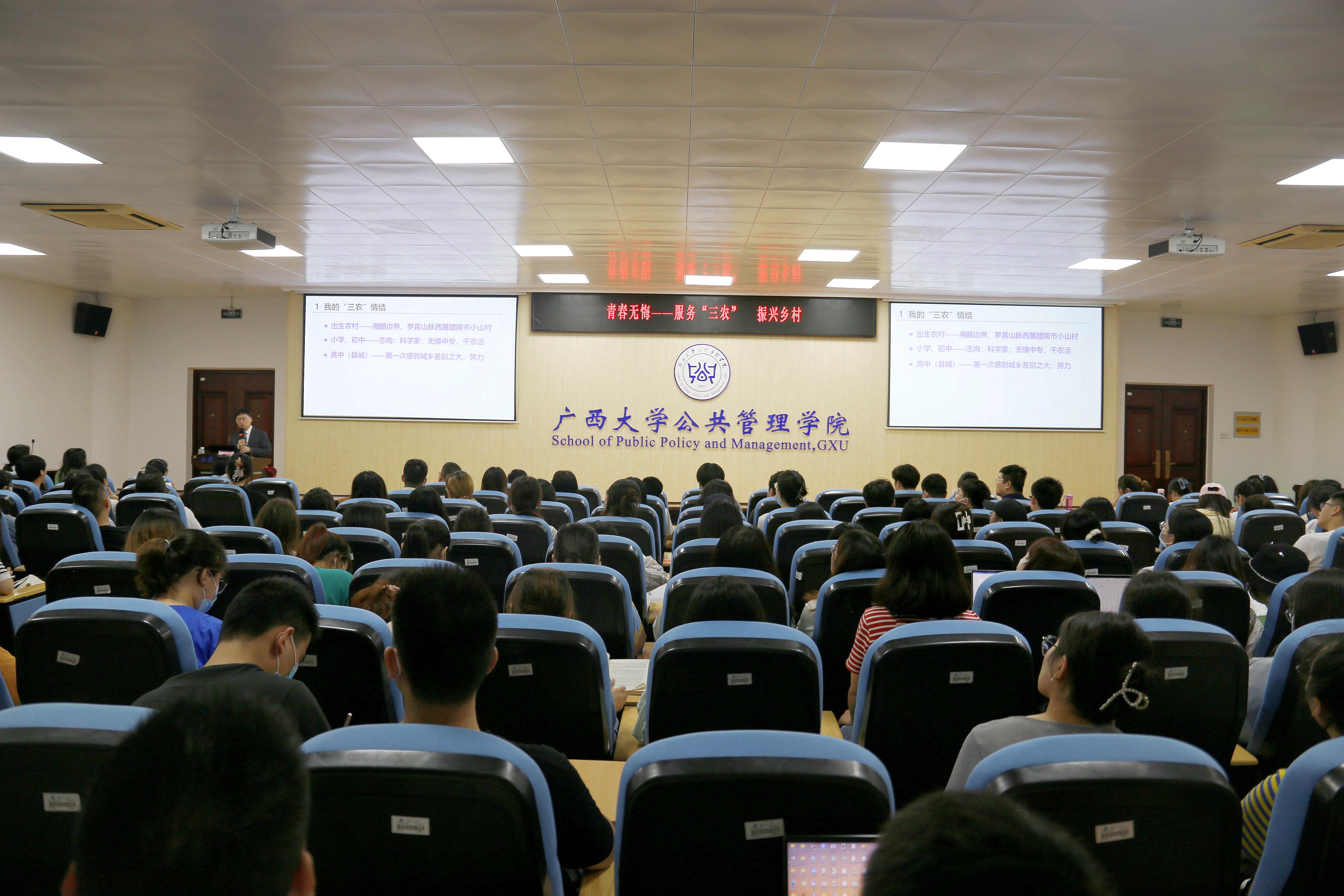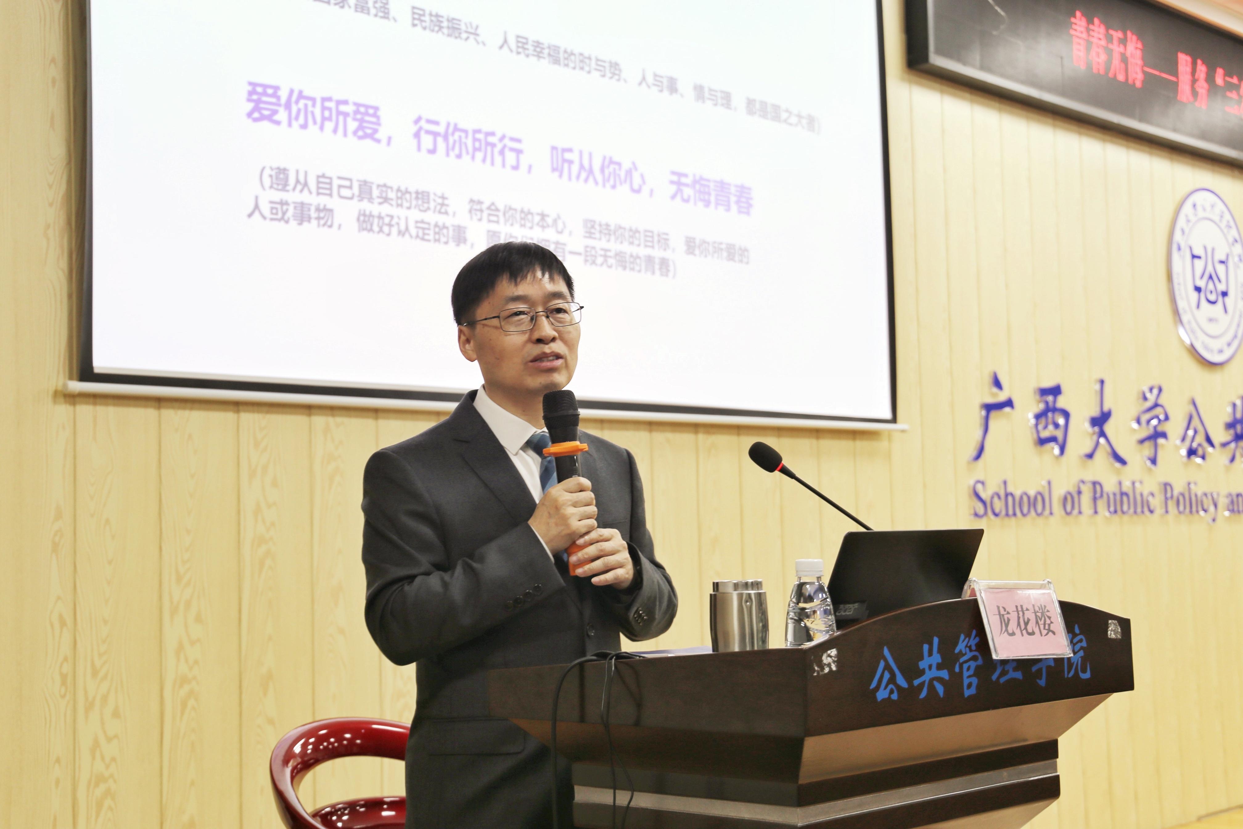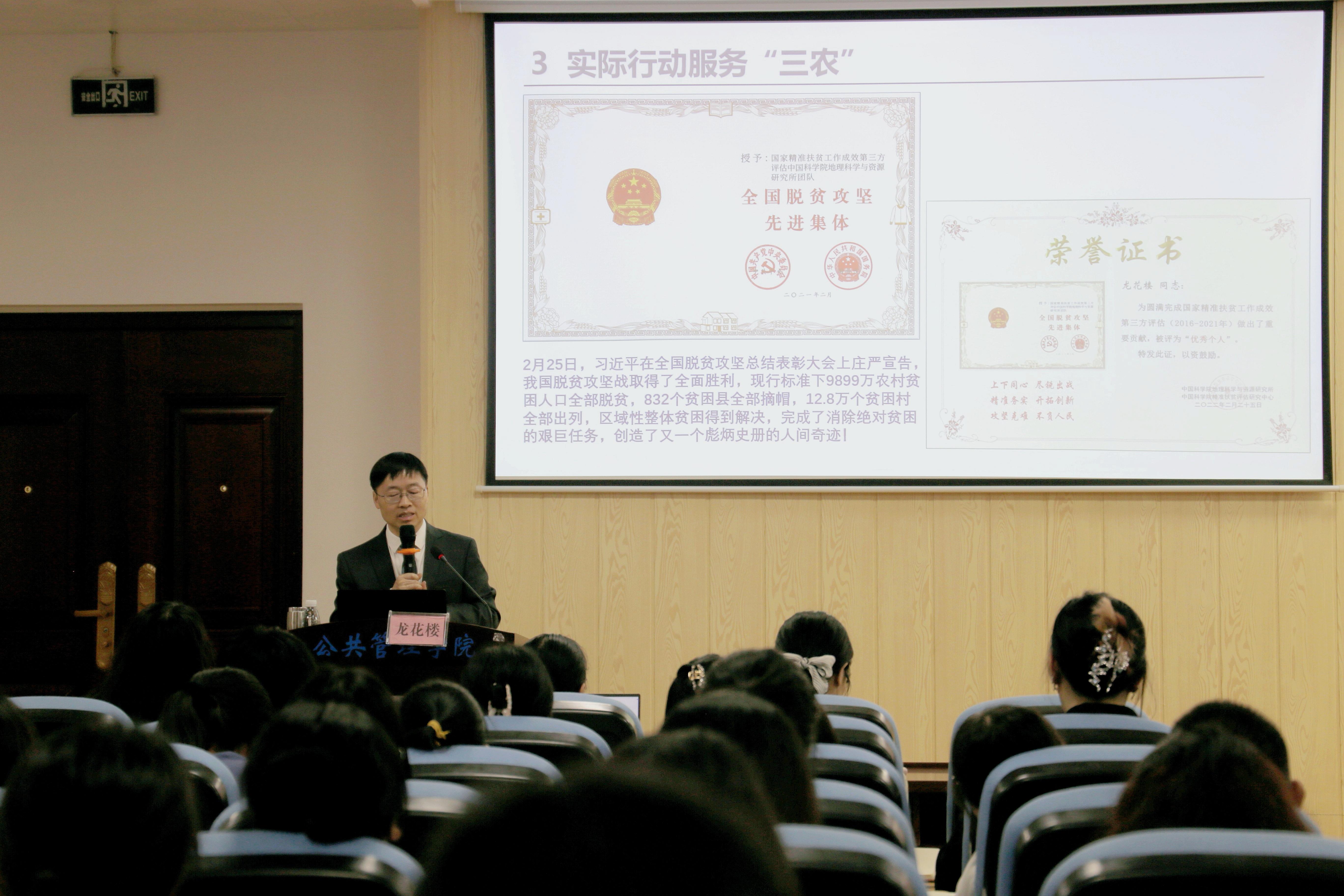 讲座内容分为四个部分:“三农”情结的萌芽,研究工作转向“三农”,用实际行动服务“三农”,及科技扶贫惠八桂。龙花楼教授回忆起自己的经历,从一个穷困的湘赣交界的小乡村一步步走到北京和奥地利、从一个师范生成长为一位长江学者的人生际遇,鼓励大家要励志勤学、刻苦磨炼,以青春之小我融入祖国之大我,平凡而不平庸,有责任、有担当,青春才会闪光。龙花楼教授以“为什么我的眼里常含泪水,因为我对这片土地爱得深沉”作为本次讲座的结语,他表示,他深深热爱着祖国大地,热爱研究八桂大地的“三农”问题,愿意为祖国的乡村振兴奉献自己的力量。最后,龙花楼教授给同学们送上寄语“心怀国之大者”、“爱你所爱,行你所行,听从你心,无悔青春”。